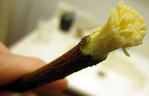 小枝の終わりの部分をほぐし、歯ブラシにします。